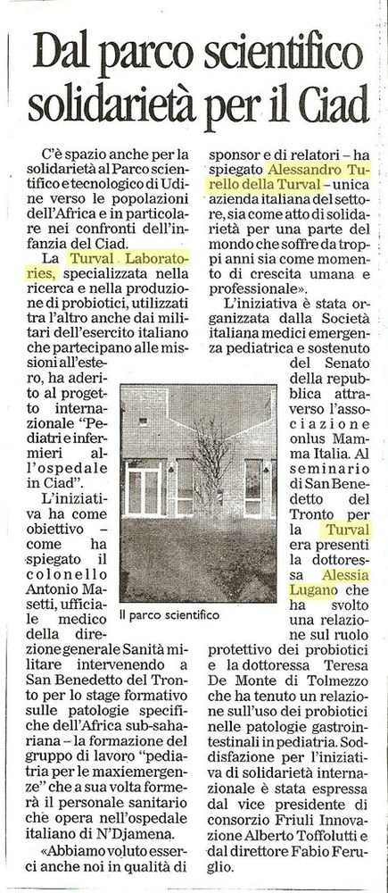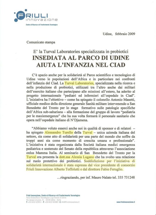 - 03-03-2009 Press release: Turval Laboratories help the childhood in Ciad / Comunicato stampa: La Turval Laboratories aiuta l'infanzia nel Ciad Turval Laboratories with head office in Scientific Park of Udine, specialized in probiotics, help the childhood in Ciad.